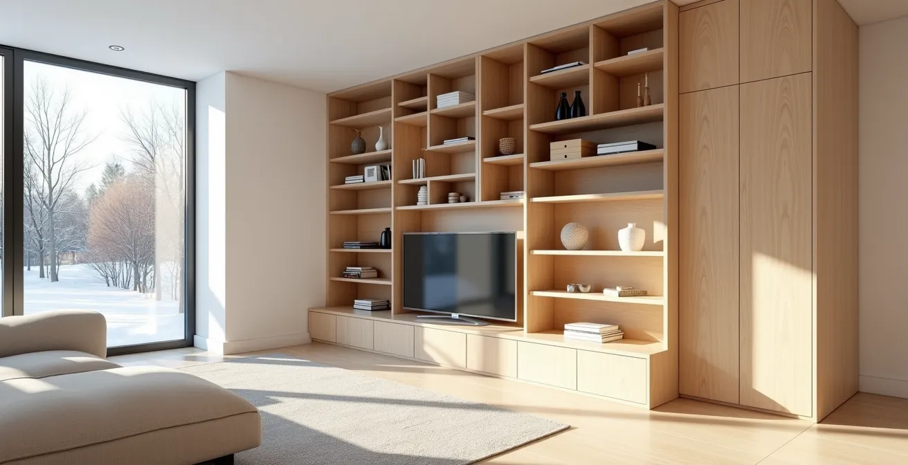La règle d’or des designers d’intérieur est le ratio 60/40. Visez à ce que 60% de votre rangement soit fermé (portes, tiroirs) pour dissimuler le désordre fonctionnel (papiers, appareils, objets du quotidien). Les 40% restants doivent être des espaces ouverts (niches, étagères) dédiés aux objets décoratifs, aux livres et aux éléments qui racontent votre histoire. Cette alternance entre plein et vide est essentielle pour que le regard puisse circuler et que le mur de rangement ne devienne pas un monolithe oppressant.