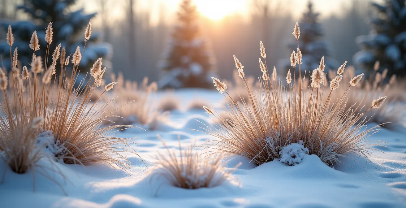 Pensez aux graminées (comme les Panicum ou les Calamagrostis) non pas comme de simples éléments décoratifs, mais comme les « gardes du corps » de vos vivaces à fleurs. Leur feuillage dense attrape la neige, créant un igloo protecteur à la base des plantes plus fragiles. Leur structure reste debout tout l’hiver, brisant le vent et offrant un intérêt visuel même sous le givre. En cultivant ces plantes indigènes, vous créez un écosystème qui s’entraide. C’est une approche bien plus intelligente que de planter des individus isolés en espérant qu’ils survivent seuls.
